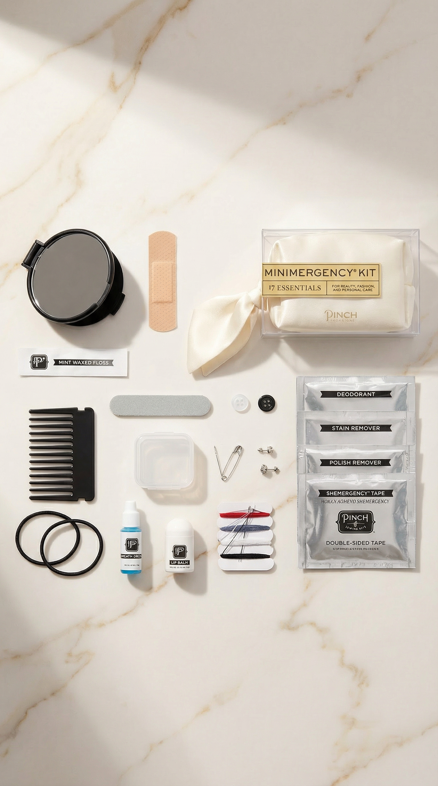 This luxury minimergency kit includes 17 beauty and fashion essentials